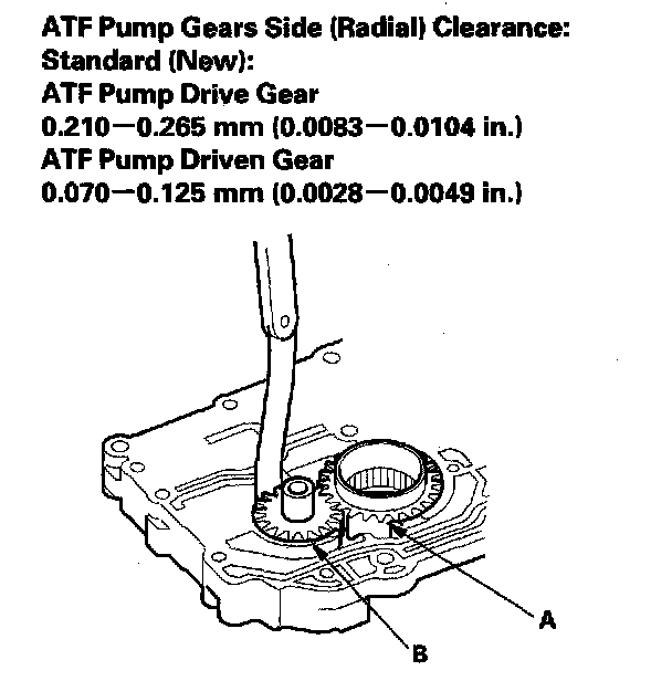 2. Measure the side clearance of the ATF pump drive gear (A) and driven gear (B).