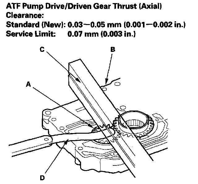 3. Remove the ATF pump driven gear shaft. Measure the thrust clearance between the ATF pump driven gear (A) and the valve body (B) with a straight edge (C) and a feeler gauge (D).