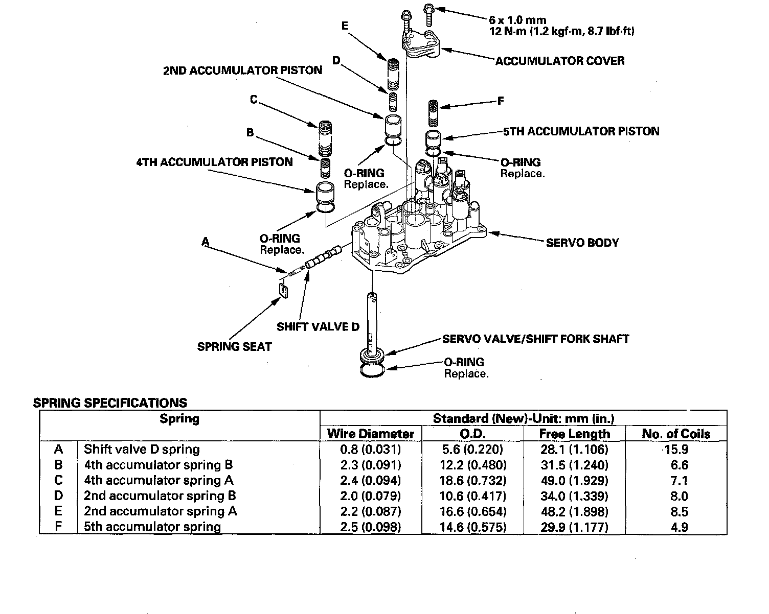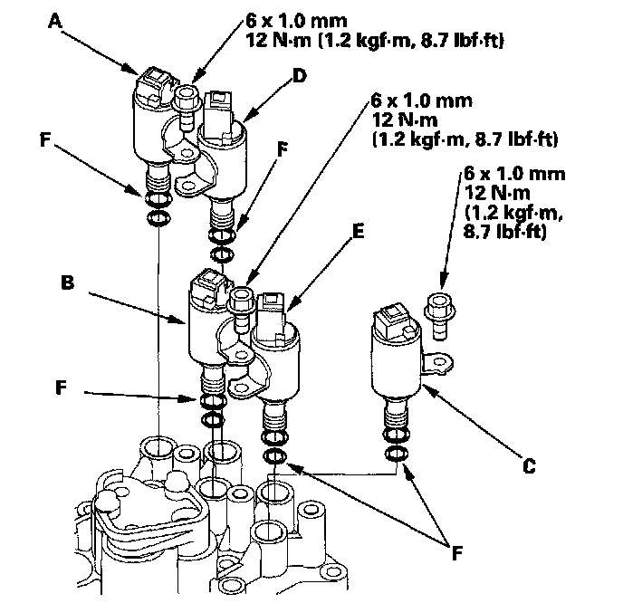 2. Install new O-rings (F) on each shift solenoid valves.