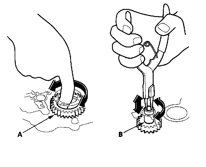 4. Make sure the ATF pump drive gear (A) rotates smoothly in the normal operating direction, and the ATF pump driven gear shaft (B) moves smoothly in the axial and normal operating direction.
