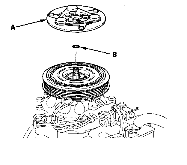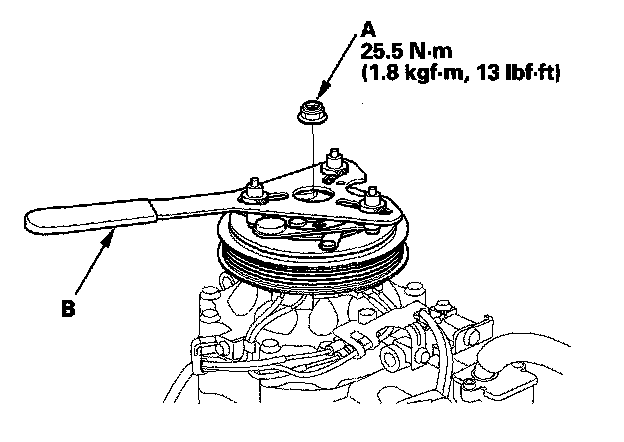 1. Remove the center nut (A) while holding the armature plate with a commercially available A/C clutch holder (B).