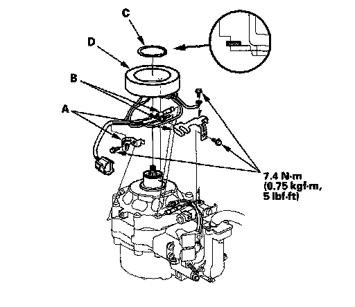 4. Remove the bolts and holders (A), then disconnect the thermal protector connectors (B). Remove the bolt from the field coil ground terminal. Remove the snap ring (C) with snap ring pliers, then remove the field coil (D). Be careful not to damage the field coil and A/C compressor.