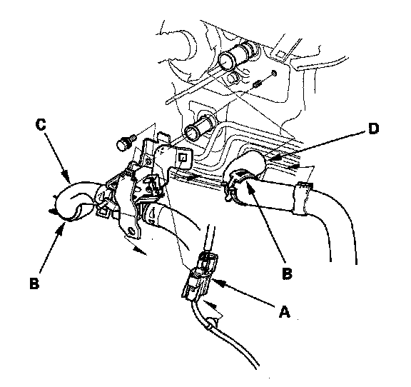 6. Remove the connector clip (A). Slide the hose clamps (B) back. Remove the bolt and heater valve bracket, then disconnect the inlet heater hose (C) and the outlet heater hose (D) from the heater unit. Engine coolant will run out when the hoses are disconnected; drain it into a clean drip pan. Be sure not to let coolant spill on the electrical parts or the painted surfaces. If any coolant spills, rinse it off immediately.