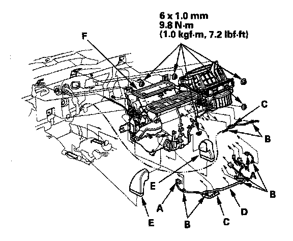 9. Disconnect the connectors (A) from the driver's air mix control motor, the passenger's air mix control motor, the evaporator temperature sensor, the heater core sensor, the power transistor, and the recirculation control motor, then remove the wire harness clips (B), the connector clips (C) and the wire harness (D). Remove the heater ducts (E), then remove the mounting nuts and the blower-heater unit(F).