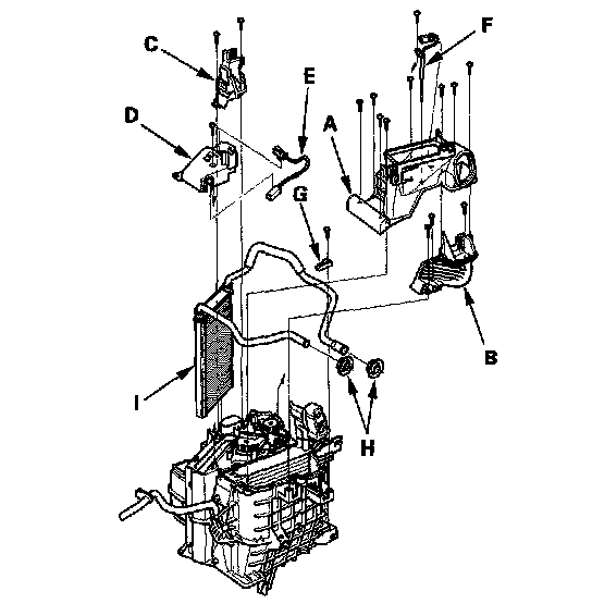 10. Remove the self-tapping screws, then remove the passenger's heater outlet (C), and the heater core cover (D), and the heater core sensor (E). Remove the self-tapping screws, the evaporator temperature sensor (F) and the joint duct A, then remove the self-tapping screws and the joint duct B. Remove the self-tapping screws, the heater pipe bracket (G), the grommets (H), and carefully pull out the heater core (I) so you don't bend the inlet and outlet pipes.