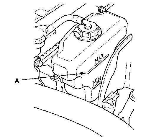 8. Fill the reserve tank to the MAX mark (A) with Honda All Season Antifreeze/Coolant Type 2 (P/N OL999-9001).