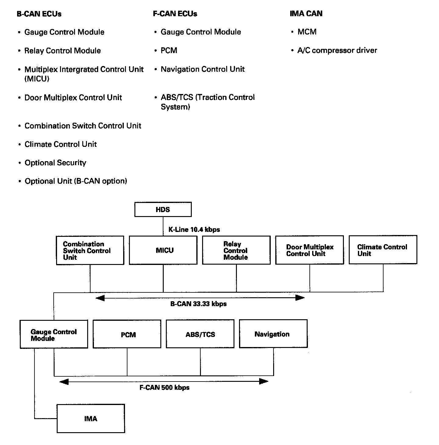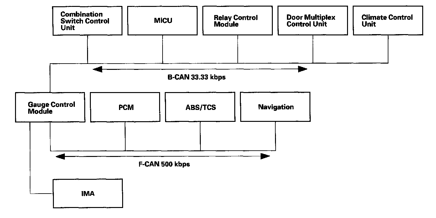 Fast controller Area Network (F-CAN) and Body Controller Area Network (B-CAN) share information between multiple Electronic Control Units (ECUs). B-CAN communication moves at a slower speed for convenience related items, and for other functions. F-CAN information moves at a faster speed for "real time" functions such as fuel and emissions data. To allow both systems to share information, the Gauge Control Module translates information from B-CAN to F-CAN and from F-CAN to B-CAN.
