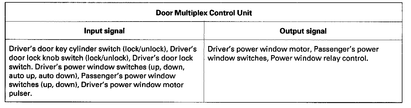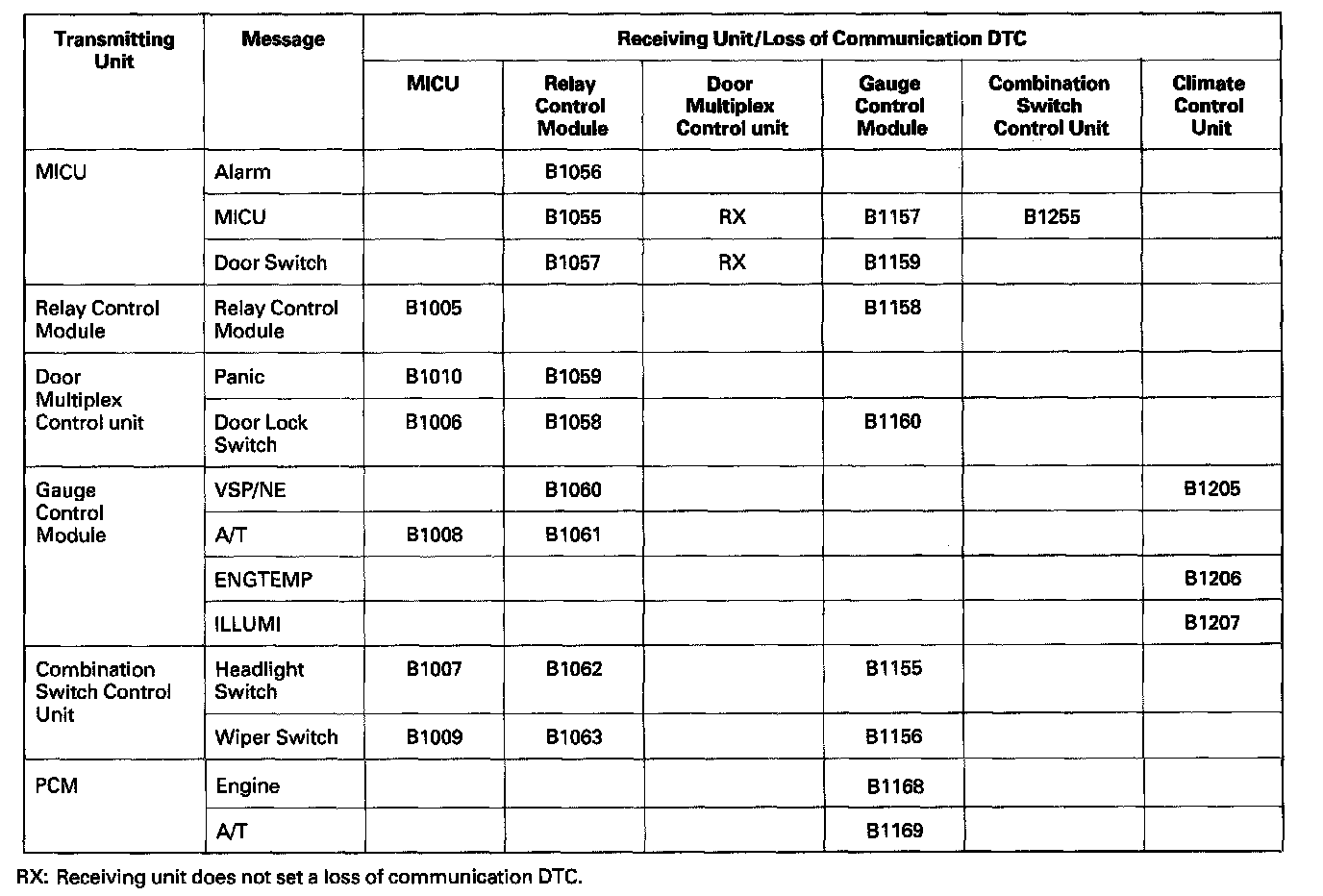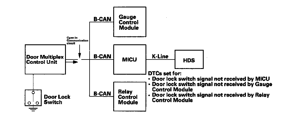 Since there is a break in the communication circuit, the door lock switch signal could not be received by the gauge control module, multiplex integrated control unit (MICU) or the relay control module. Each of these units will set "loss of communication" error codes for the signal(s) they did not receive. There maybe multiple communication DTCs if the unit that has become disconnected from the network would normally transmit multiple messages during the communication line test. For example, the door multiplex control unit sends keyless panic signal and door lock switch signal during the communication circuit test.