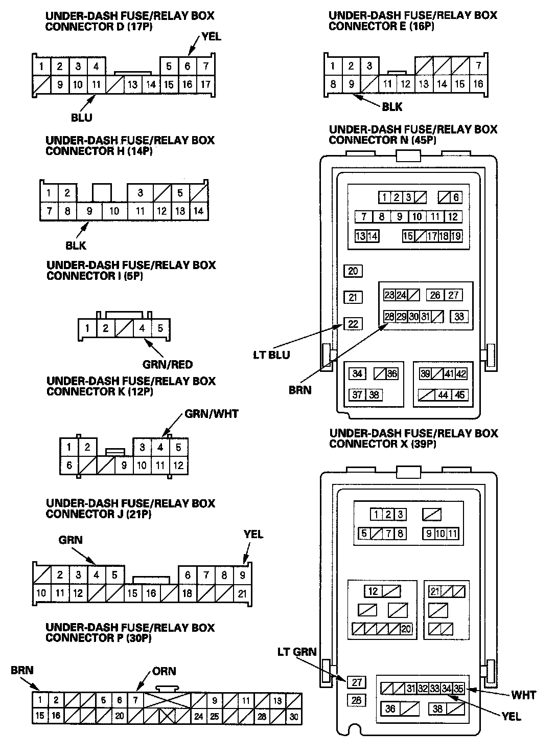 2. Disconnect the under-dash fuse/relay box connectors D, E, H, I, J, K, N, P and X.