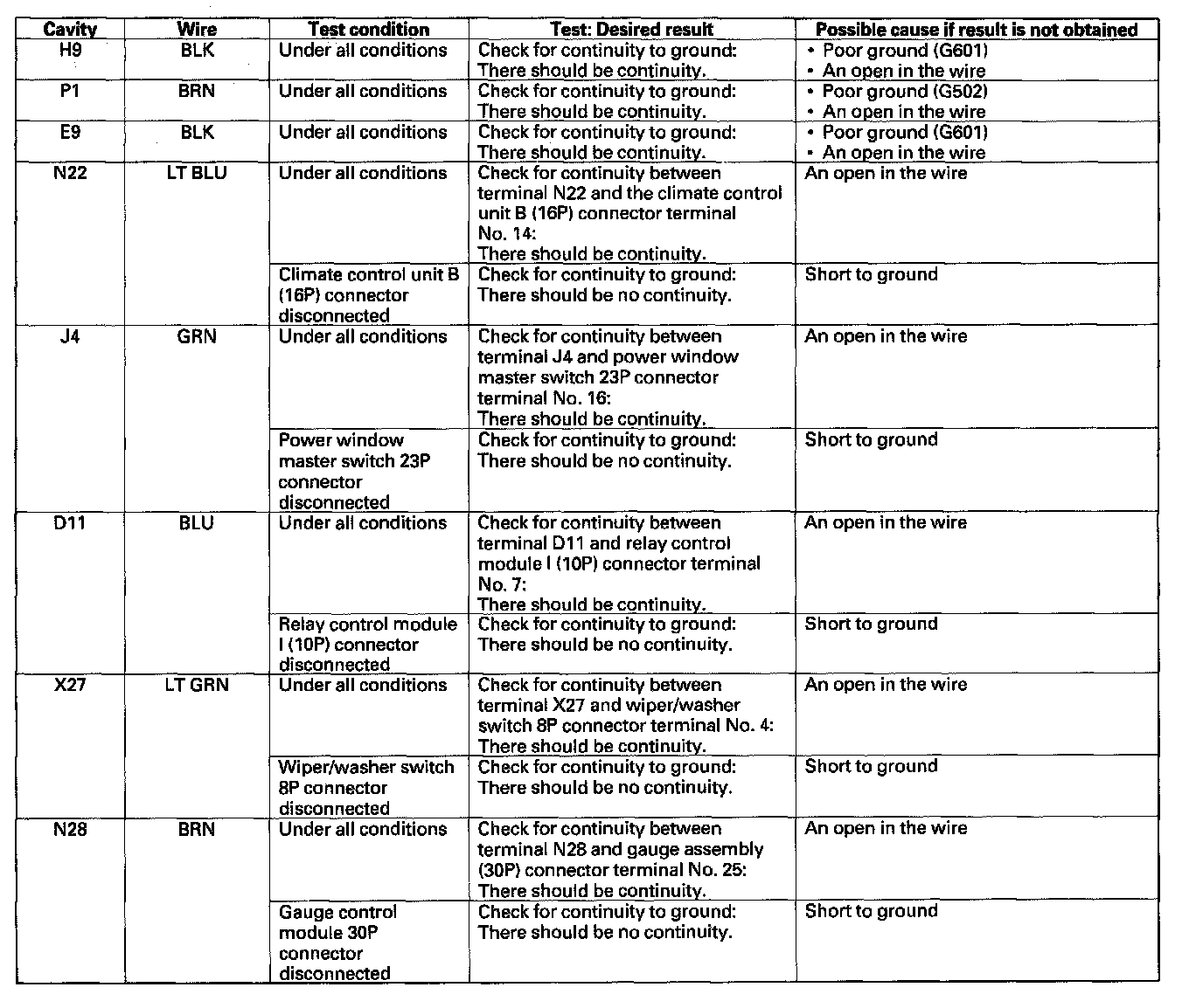 5. Reconnect the connectors to the under-dash fuse/relay box, and make sure these input tests at the appropriate connectors on the under-dash fuse/relay box.