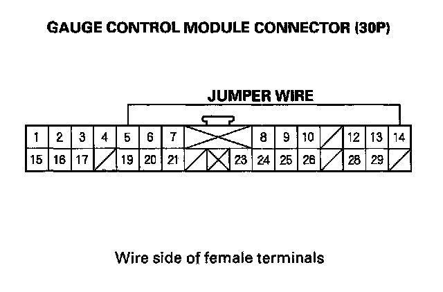 8. Install a jumper wire between the No. 5 terminal and the No. 14 terminal of the gauge control module connector (30P). The SRS indicator should go off.