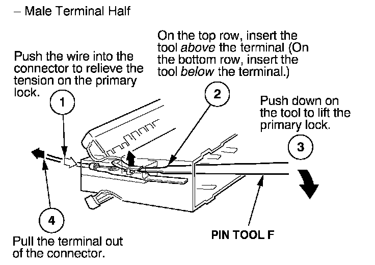 Before you begin, inspect the wire you are about to repair for damage and length. Make sure the wire will be long enough to make a terminal repair without stretching it when you reinstall the terminal in the connector. If the wire is too short, or if access to the connector is too restricted to make a terminal repair, you may need to install a pigtail terminal (a short length of wire with a factory-crimped terminal on it). Refer to HOW TO INSTALL PIGTAIL TERMINALS.