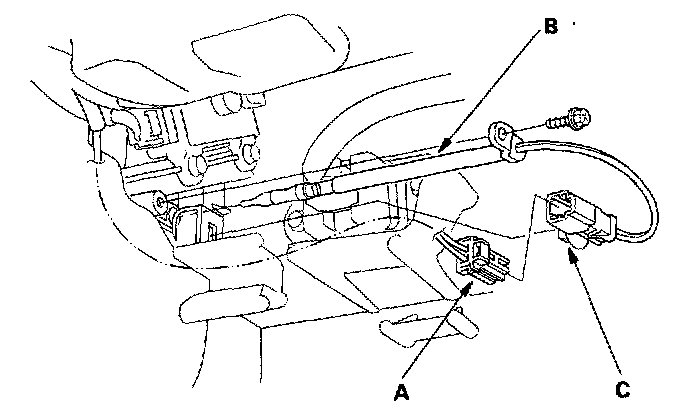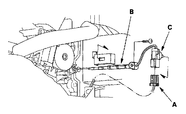 3. Disconnect the 2P connector (A) from the evaporator temperature sensor (B), then remove the connector clip (C). Remove the self-tapping screw, and carefully pull out the evaporator temperature sensor.