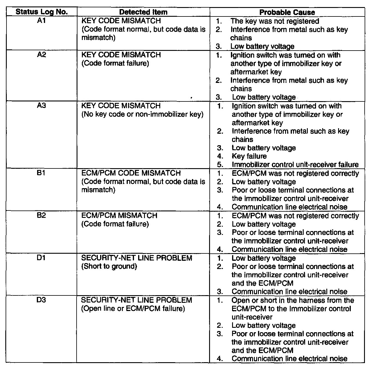 Status LogIf you suspect there is a immobilizer system problem, check the status log.