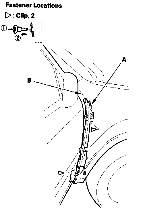 3. Open the front door. From outside the door, remove the upper clip, and from inside the door, remove the lower clip securing the front fender fairing (A) and front fender (B).