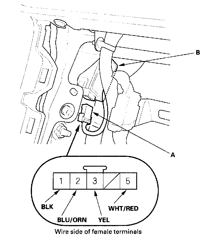 2. Disconnect the 5P connector (A) from the keyless receiver unit (B)
