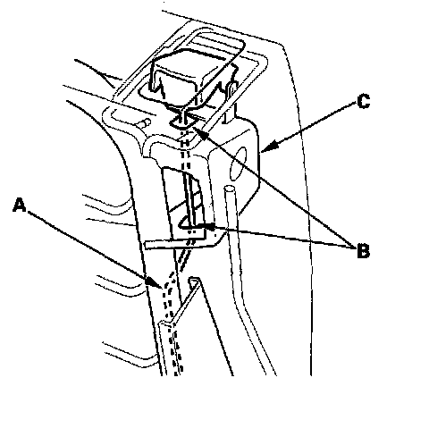 - Make sure the lock knob rod (A) is passed through the holes (B) in the seat-back frame (C) correctly when reinstalling the latch lever.