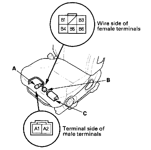 2. Disconnect the seat heater harness 2P connector (A) from the seat subharness and the 6P connector (B) from the seat heater relay (C).