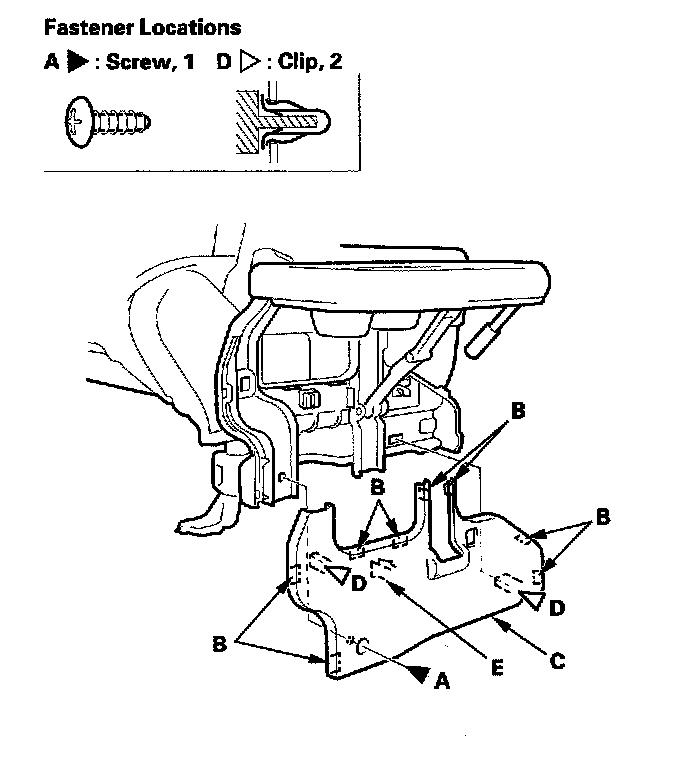 2. Remove the screw (A), release the tabs (B), and pull the outer cover (C) back to detach the clips (D) and hooks (E), then remove it.