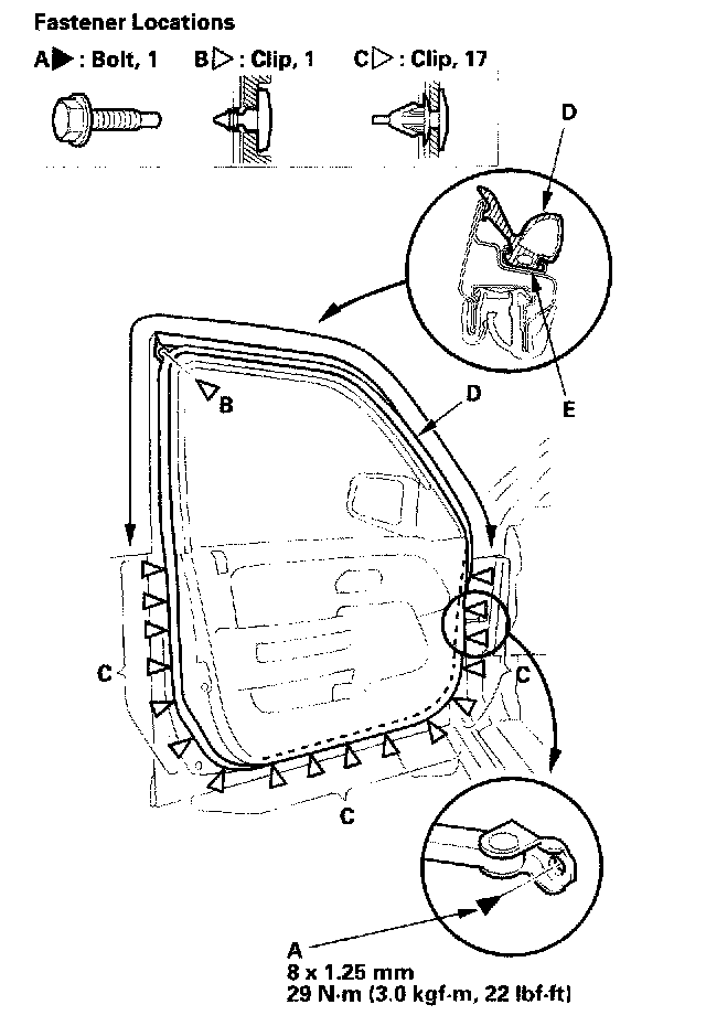 2. Detach the clips (B, C), then remove the door weatherstrip (D).