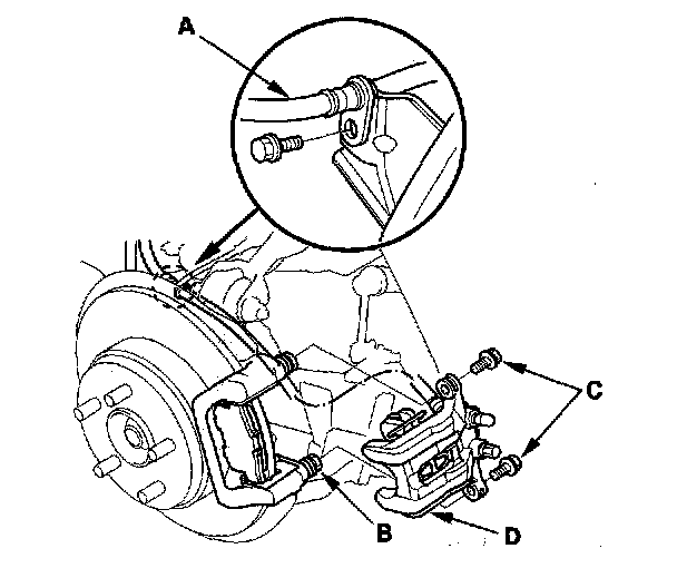 2. Hold the pins (B) with a wrench, being careful not to damage the pin boots. Remove the caliper bolts (C), and remove the caliper (D) with inner pad from the caliper bracket.