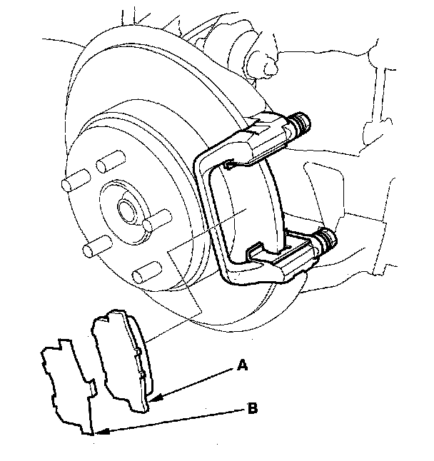 3. Remove the outer pad (A) and pad shim (B).