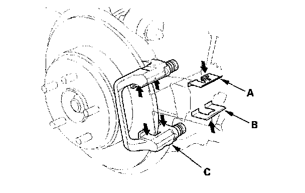 8. Apply Molykote M-77 assembly paste to the pad retainers on their mating surface against the caliper bracket (C) and brake pads. Wipe excess assembly paste off the retainers. Contaminated brake discs and brake pads reduce stopping ability. Keep assembly paste and grease off the brake discs and brake pads.