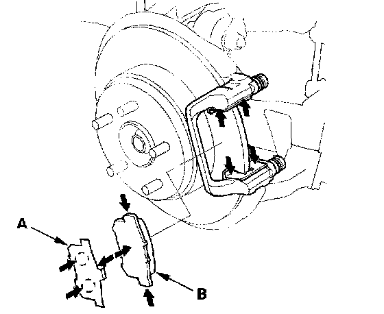 10. Apply Molykote M-77 assembly paste to the pad shim (A), the back of the outer pad (B), and the other areas indicated by arrows. Wipe excess assembly paste off the retainers. Contaminated brake discs and brake pads reduce stopping ability. Keep assembly paste and grease off the brake discs and brake pads.