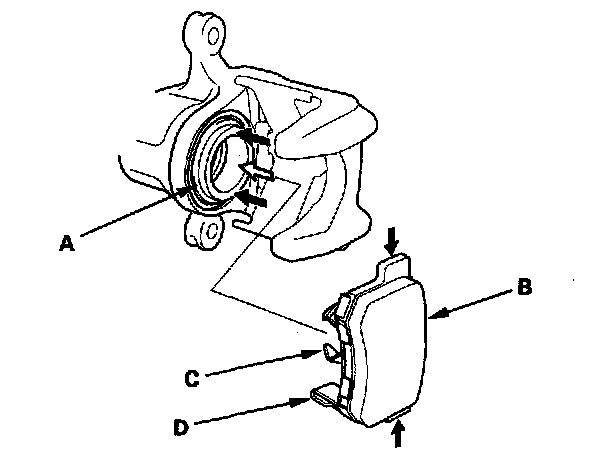 14. Push the pad hold spring (C) into the piston, then install the inner pad with the indicator (D) on the lower side.