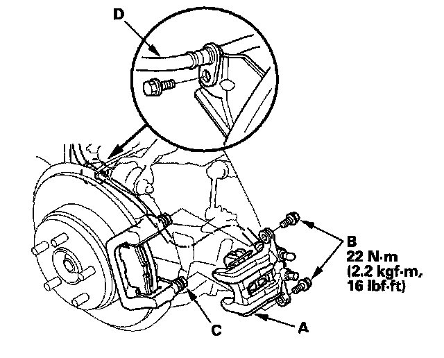 16. Install the brake hose (D) to the knuckle.