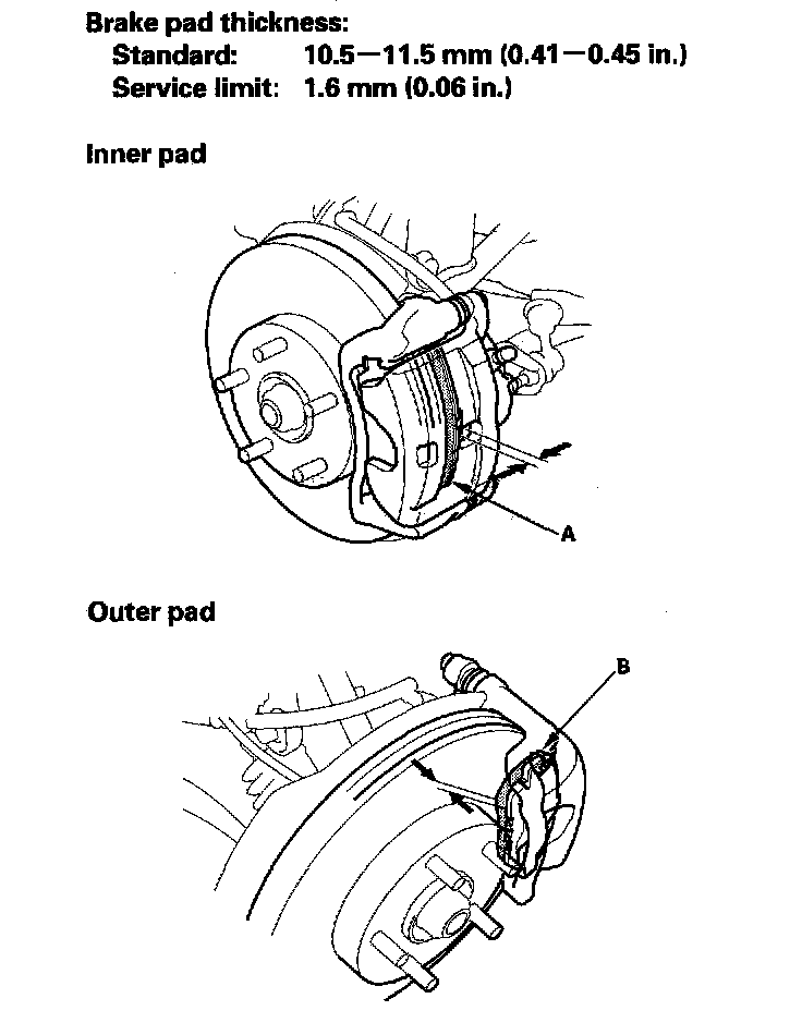 2. Check the thickness of the inner pad (A) and outer pad (B). Do not include the thickness of the brake pad backing plate.
