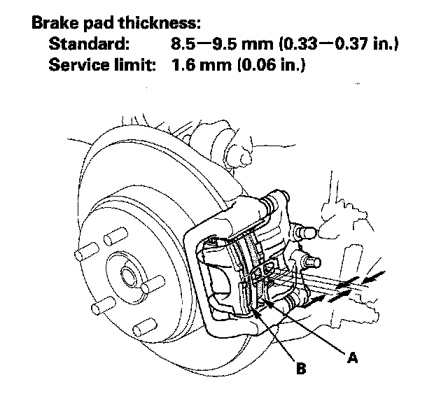2. Check the thickness of the inner pad (A) and outer pad (B). Do not include the thickness of the brake pad backing plate.