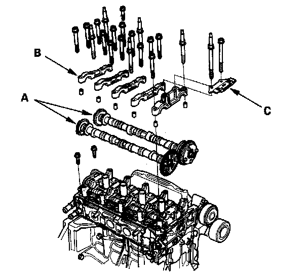 7. Set the camshaft holders (B) and cam chain guide B (C) in place.