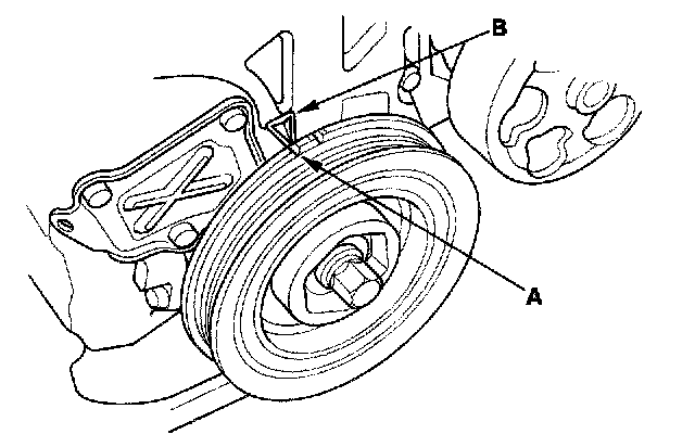 1. Turn the crankshaft pulley so its top dead center (TDC) mark (A) lines up with the pointer (B).
