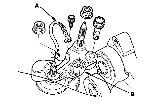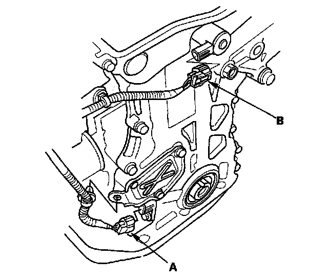 7. Disconnect the crankshaft position (CKP) sensor connector (A) and variable valve timing control (VTC) oil control solenoid valve connector (B).