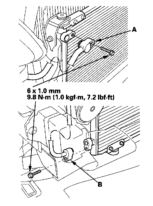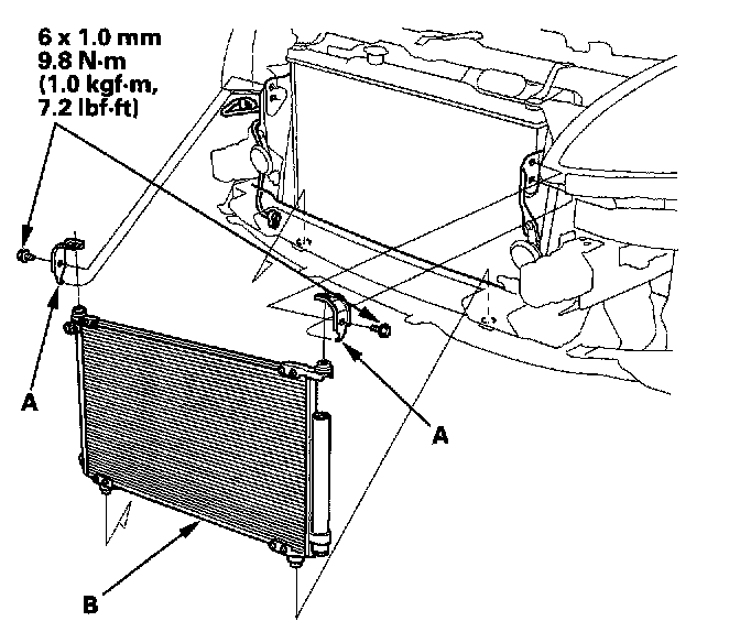 4. Remove the bolts and mounting brackets (A), then remove the A/C condenser (B) by lifting it up. Be careful not to damage the radiator or the A/C condenser fins when removing the A/C condenser.