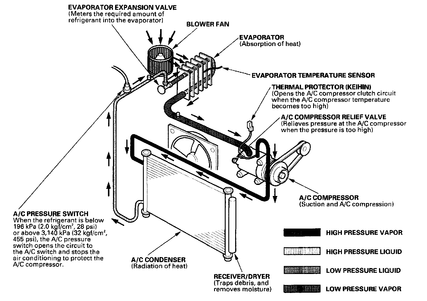 System DescriptionThe air conditioning system removes heat from the passenger compartment by circulating refrigerant through the system as shown.