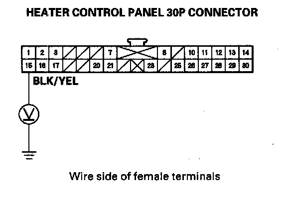 4. Measure the voltage between the No. 15 terminal of the heater control panel 30P connector and body ground.