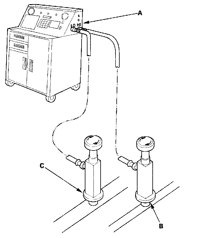 2. Connect an R-134a refrigerant recovery/recycling/ charging station (A) to the high-pressure service port (B) and the low-pressure service port (C), as shown, following the equipment manufacturer's instructions. Evacuate the system.
