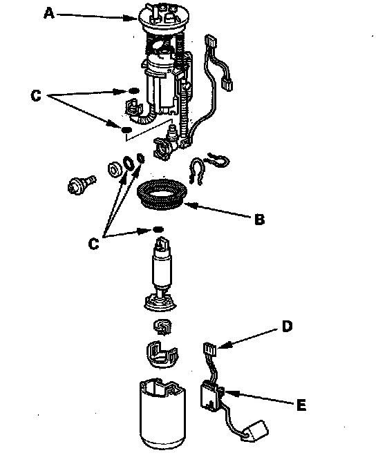 - When installing the fuel gauge sending unit (E), make sure the connection is secure and the connector is firmly locked into place. Be careful not to bend or twist it excessively.