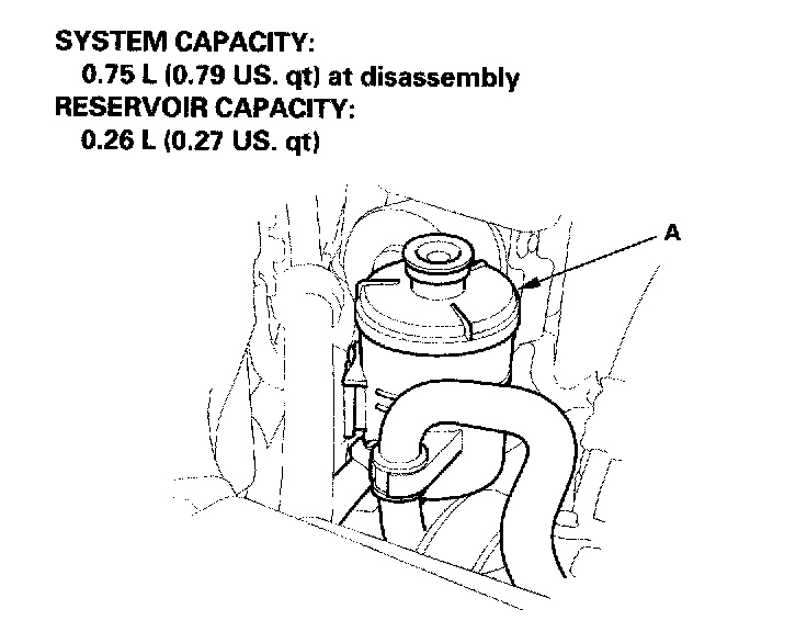 Fluid ReplacementCheck the reservoir (A) at regular intervals, and add the recommended fluid as necessary. Always use Honda Power Steering Fluid. Using any other type of power steering fluid or automatic transmission fluid can cause increased wear and poor steering in cold weather.