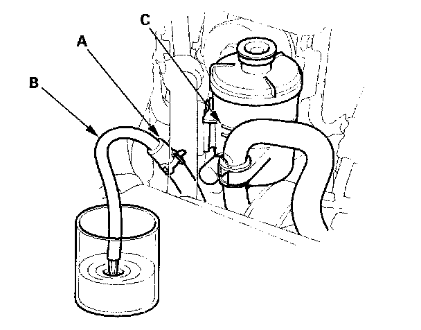 3. Start the engine, let it run at idle, and turn the steering wheel from lock-to-lock several times. When fluid stops running out of the hose, shut off the engine. Discard the fluid.