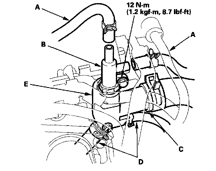 5. Disconnect the radiator upper hose (C) and the engine coolant bypass hoses (D) from the engine coolant outlet (E).