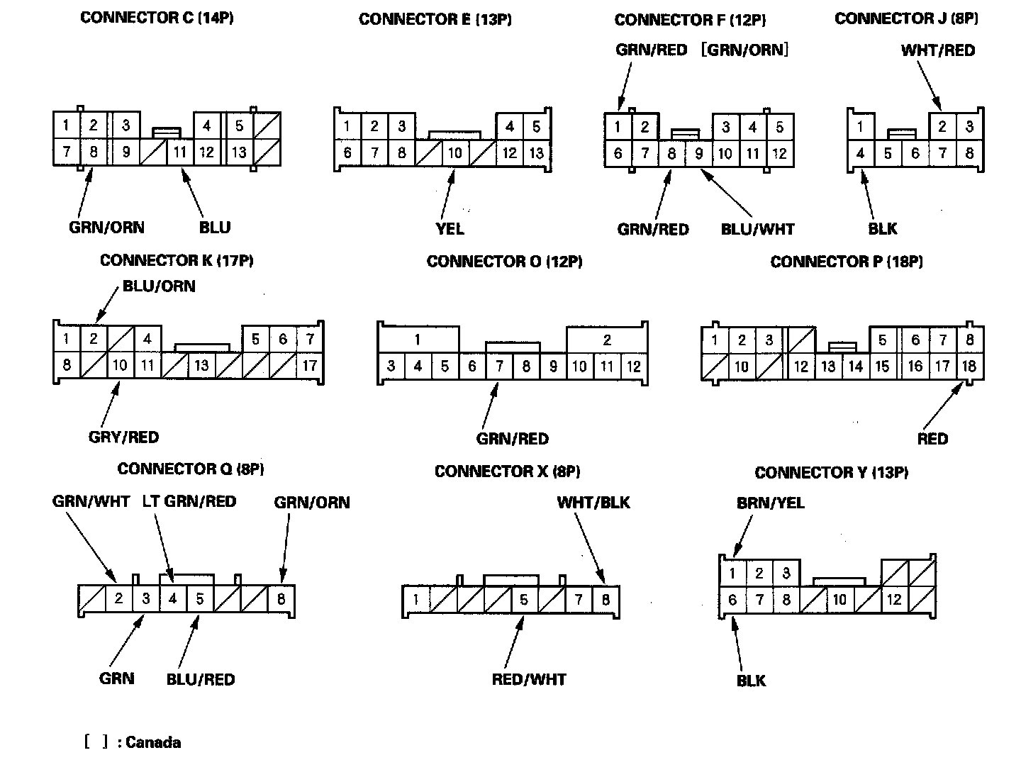 2. Disconnect the under-dash fuse/relay box connectors C, E, F, J, K, 0, P, Q, X and Y.