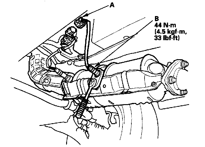 1. Disconnect the secondary HO2S 4P connector (A), then remove the secondary HO2S (B).
