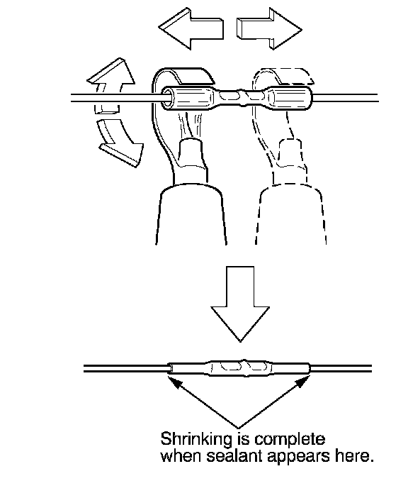 13. Plug in the heat gun, and turn it on. Start at the middle of the splice connector, and move the gun toward the ends as the tube shrinks. Apply heat evenly by rotating the curved heat spreader around the splice connector. Shrinking is complete when a small amount of sealant appears at each end of the tube.