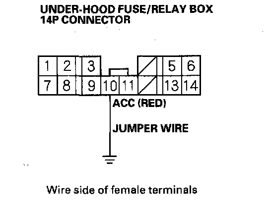 9. Momentarily connect under-hood fuse/relay box 14P connector terminal No.10 to body ground with a jumper wire several times.