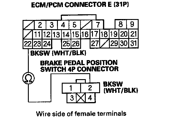 9. Check for continuity between ECM/PCM connector terminal E22 and brake pedal position switch 4P connector terminal No.2.