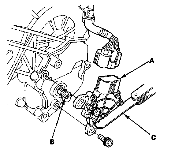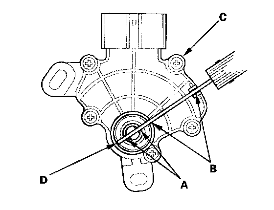 7. Align the cutouts (A) on the rotary-frame with the neutral positioning cutouts (B) on the transmission range switch (C), then put a 2.0 mm (0.08 inch) feeler gauge blade (D) in the cutouts to hold the switch in the N position.