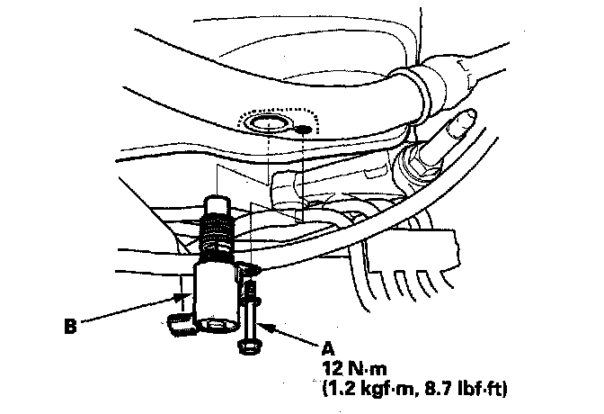 2. Remove the bolt (A) and the VTC oil control solenoid valve (B).
